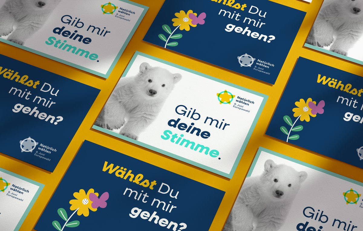 Eine geringe Wahlbeteiligung bei der letzten Wahl und das gesenkte Wahlalter auf 16 Jahre bedeutete ein Potential, aber auch eine Herausforderung für die Kampagne, die Zielgruppen für die Europawahl 2024 zu mobilisieren. Mit Humor, ernsthaften Inhalten und mutigen Design mit Haltung haben wir eine Brücke für die Kampagnenmaterialien gebaut, um sowohl großen Mitgliedsorganisationen wie WWF oder Campact als auch kleinen regionalen Naturschutzverbänden das für sie sinnvollste Kommunikationsmaterial an die Hand zu gebe.